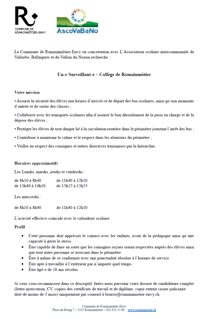 La Commune de Romainmôtier-Envy en collaboration avec l'AscoVaBaNo est à la recherche d'un/e Surveillant / e pour le Collège de Romainmôtier
