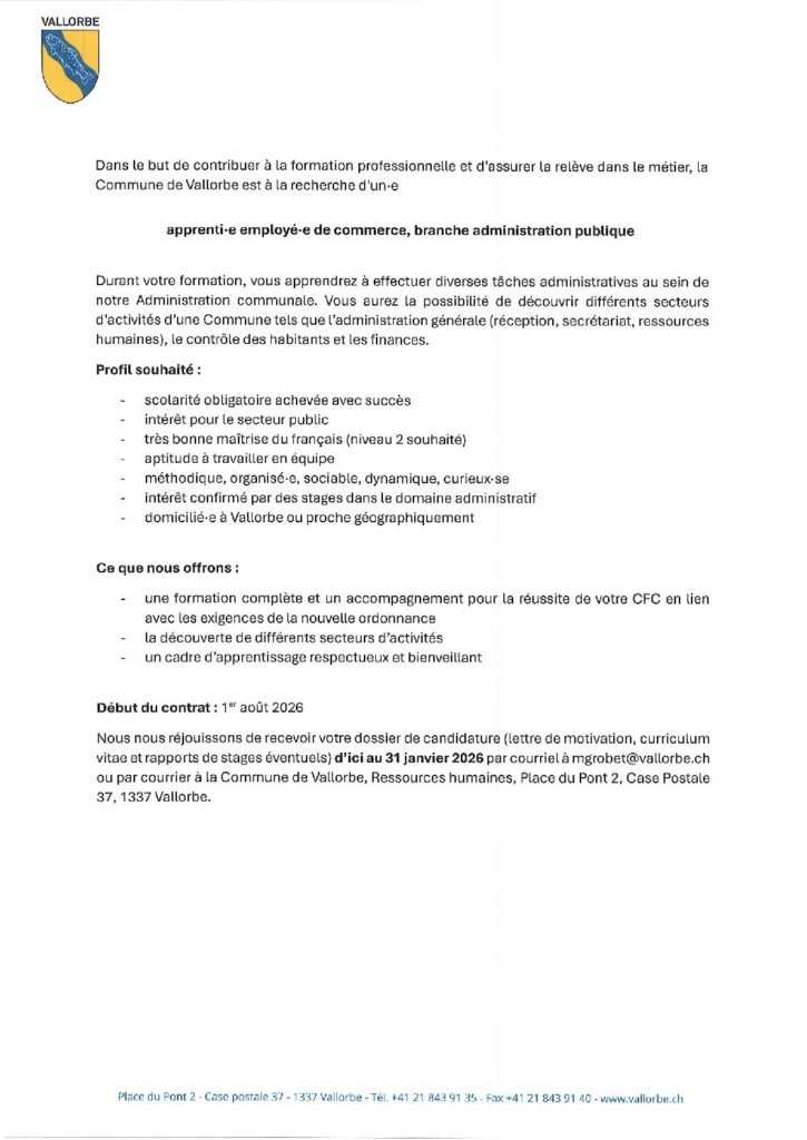 La Commune de Vallorbe est à la recherche d’un apprenti employé-e de commerce